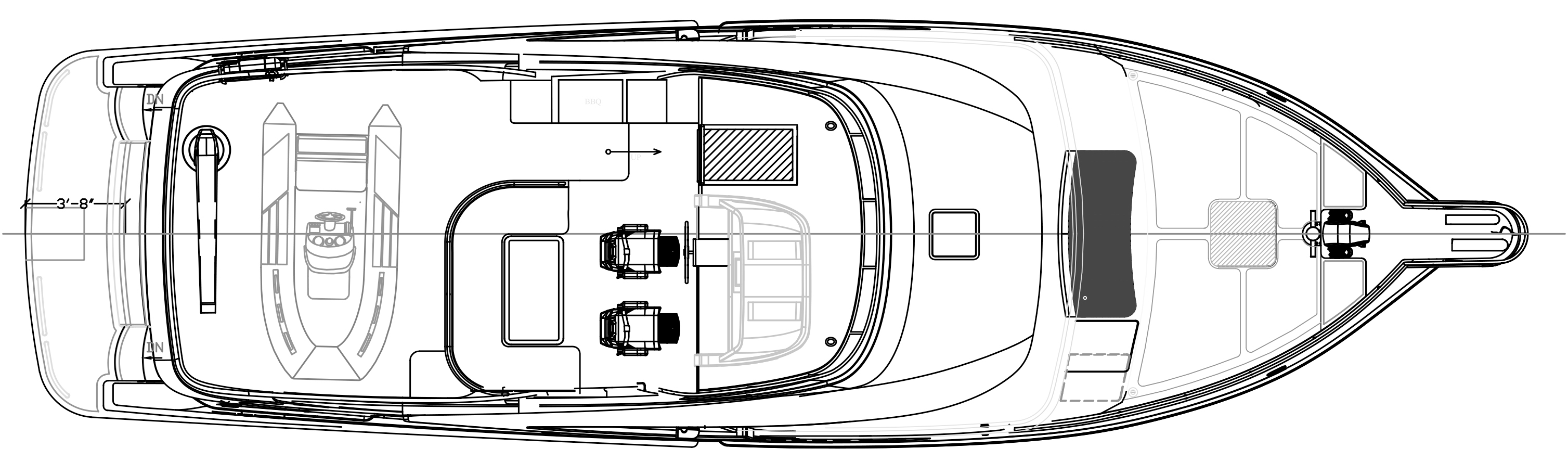 - Expansive flybridge with control station and large U-shaped settee