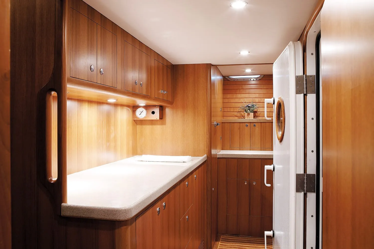 An expansive and functional flybridge layout incorporates a 10-person U-shaped sofa with a built-in BBQ, sink and refrigerator. One of the unique selling points of the Selene 60 is its full-height commissary, or utility room, that is placed between the owner’s cabin and the engine room for storage, freezer, washer/dryer and access to the electrical compartment.